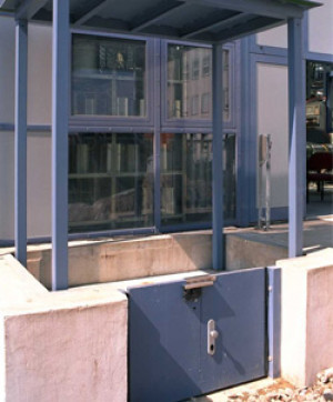 Hebebühne mit 3 gegenüberliegenden Haltestelle mit entsprechend verriegelten Türen. |